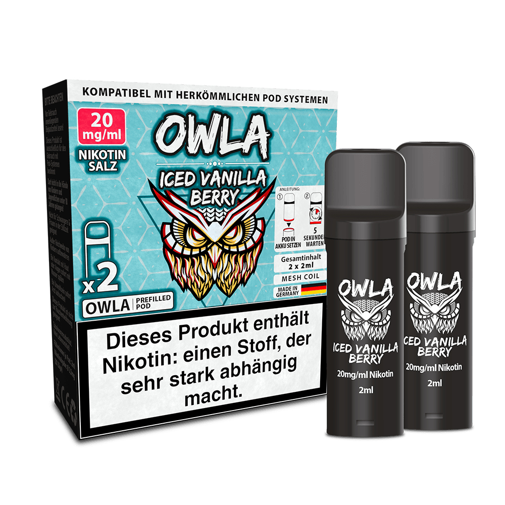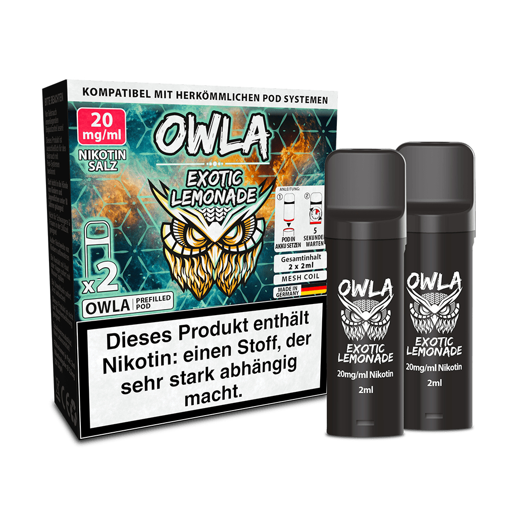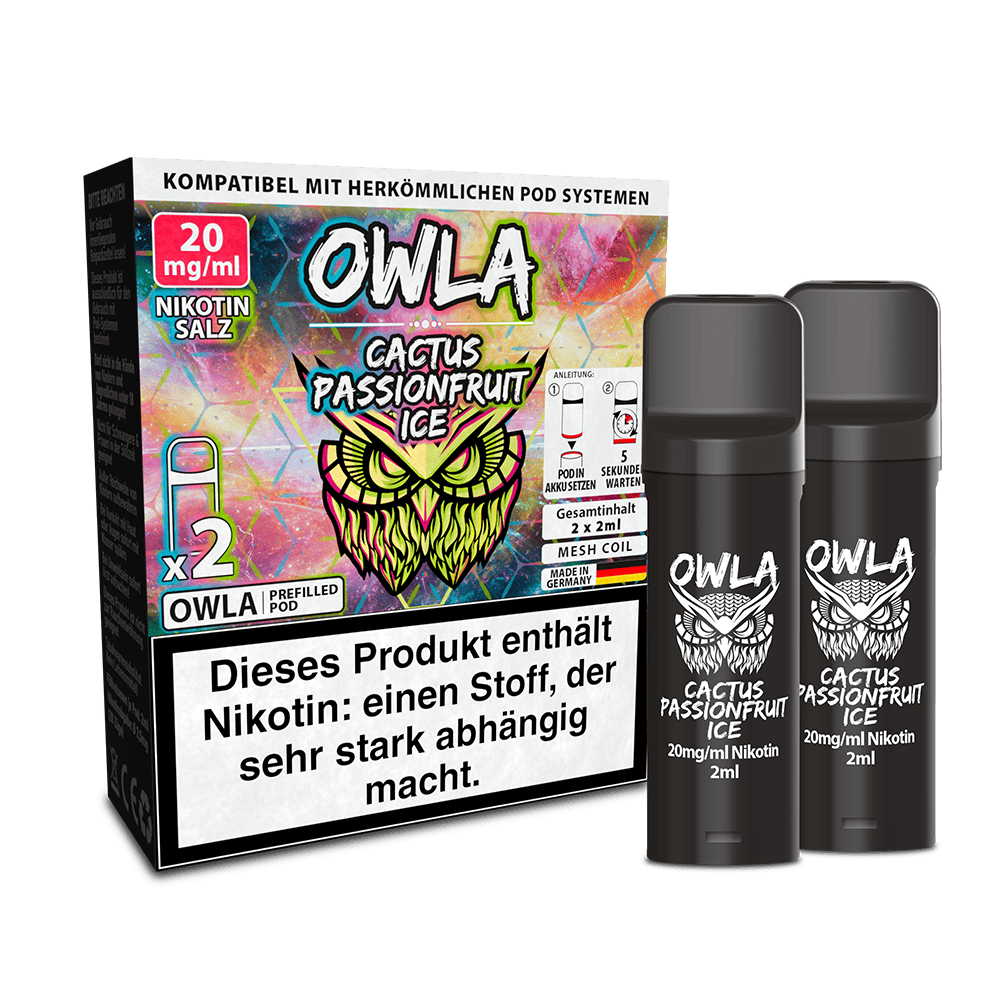 Owla Pods Cactus Passionfruit Ice verbindet den Geschmack von exotischer Passionsfrucht mit einer frischen Kaktusnote und einem kühlenden Ice-Effekt. Geschmacklich beginnt das Liquid mit der intensiven Passionsfrucht, die eine typische Mischung aus süßer Tropenfrucht und feiner Säure mitbringt. Dadurch wirkt das Aroma lebendig und nicht überladen. Die Fruchtbasis wird durch eine leichte Kaktusnote ergänzt, die dem Geschmack eine frische, leicht grüne Komponente verleiht. Abschließend sorgt der Ice-Effekt für eine angenehme Kühle, die das Aroma klarer wirken lässt und insbesondere beim häufigen Dampfen für Frische sorgt. Die Pods sind bereits mit Nikotinsalz-Liquid befüllt und für Pod-Systeme geeignet. Nikotinsalz ermöglicht eine schnelle Nikotinaufnahme bei gleichzeitig sanftem Zugverhalten, was besonders bei kompakten Pod-Systemen von Vorteil ist. Für die Verdampfung setzt Owla auf eine integrierte Mesh-Coil, die das Liquid gleichmäßig erhitzt. Dadurch entfalten sich die einzelnen Aromen klar und bleiben über die gesamte Nutzungsdauer stabil.